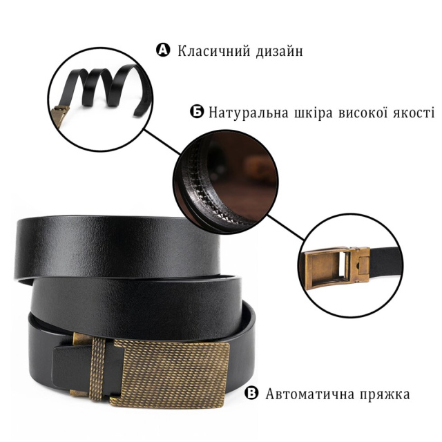 Шкіряний чоловічий ремінь найвищої якості. Виріб з легкістю доповнить будь-який ваш образ. У поєднанні з оригінальною пряжкою кольору латунь і дрібною зернистістю у вигляді смужок ремінь не залишить байдужим будь-якого чоловіка. Автоматична пряжка ремінця дуже практична і проста у використанні. Шкіряний ремінь вже давно став невід'ємною частиною базового чоловічого гардероба. За якістю аксесуар нічим не поступається дорогим іменитим брендом. Рекомендуємо до покупки даний ремінець. Виріб стане прекрасним подарунком для будь-якого чоловіка.