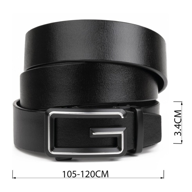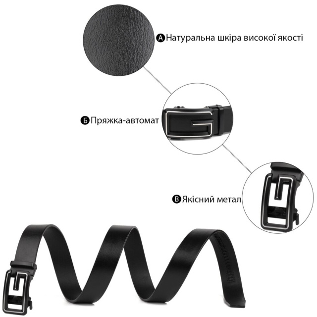 Якісний шкіряний ремінь чорного кольору з натуральної шкіри. Виріб прекрасно підійде під будь-який ваш образ. Пряжка ремінця нагадує букву G в поєднанні з затемненим металом. Автоматична пряжка дуже проста в експлуатації. Ремінь не прив'язує вас до певного взуття. За якістю аксесуар нічим не поступається дорогим брендам, але при цьому коштує значно дешевше. Впевнені, що ремінь підкорить будь-якого чоловіка. Рекомендуємо вам дану модель, якщо ви перебуваєте в пошуку якісного повсякденного ременя.