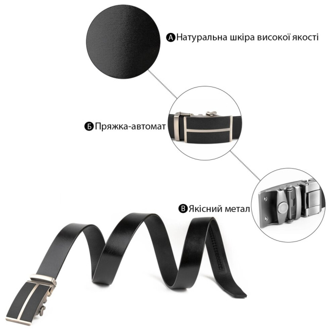 Класичний чоловічий ремінь найвищої якості з цілісного полотна натуральної шкіри. Виріб доповнено автоматичною пряжкою з чорними матовими вставками. Шкіряний ремінь виглядає дуже солідно і стильно. Аксесуар прекрасно підійде під будь-який ваш образ. Ремінь вже давно став основним елементом чоловічого гардероба. Пряжка ремінця виконана з міцного металу і прослужить далеко не один рік. Виріб стане прекрасним подарунком для будь-якого чоловіка і залишить тільки найкращі враження.