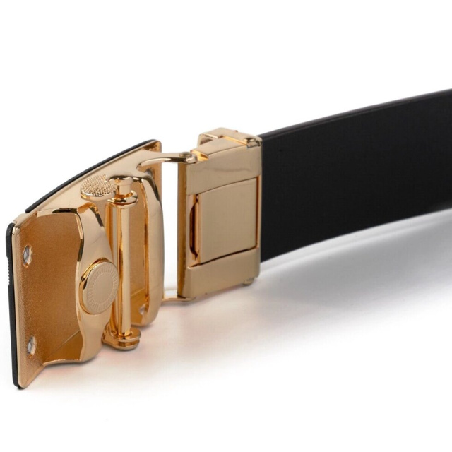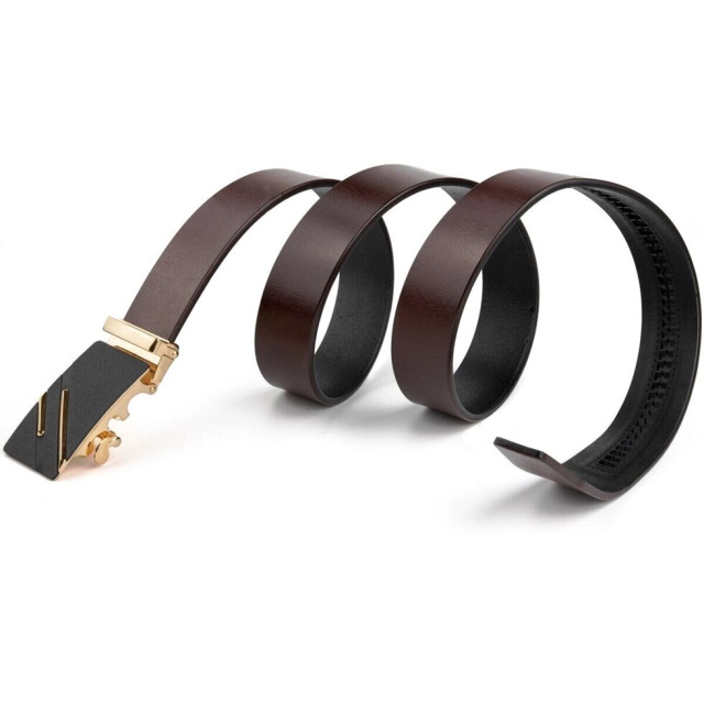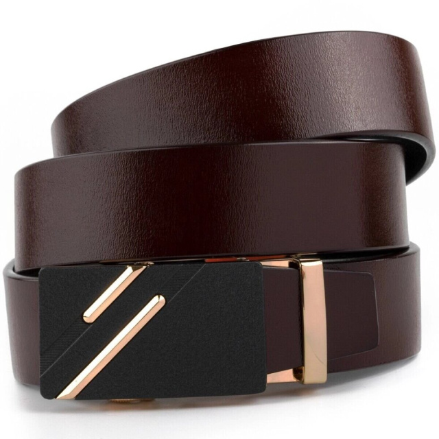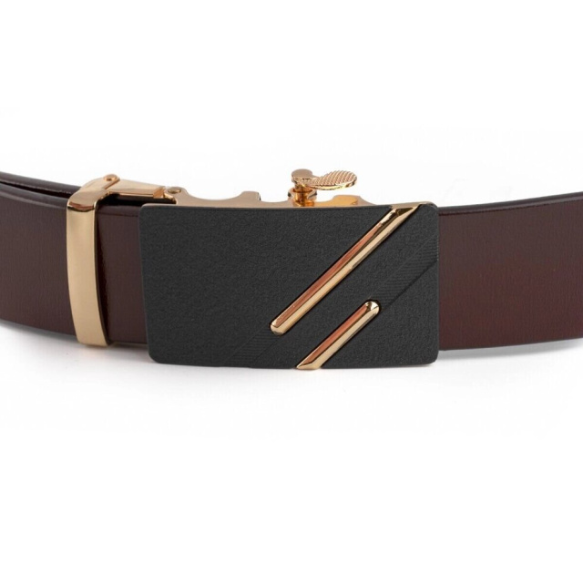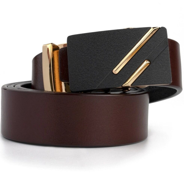Шкіряний чоловічий ремінь насиченого коричневого кольору. Виріб красиво переливається на сонці. Стильний ремінь - невід'ємна частина чоловічого гардеробу. Виріб виконаний з цілісного полотна і прослужить вам далеко не один рік. Пряжка виконана з міцного сплаву золотистого кольору з чорною заливкою і золотистими діагональними смужками. Автоматична пряжка дуже проста в експлуатації. Ремінь не прив'язує вас до певного взуття. За якістю аксесуар нічим не поступається дорогим брендам, але при цьому коштує значно дешевше. Впевнені, що ремінь підкорить будь-якого чоловіка. Рекомендуємо вам дану модель, якщо ви перебуваєте в пошуку якісного повсякденного ременя.