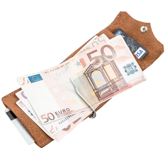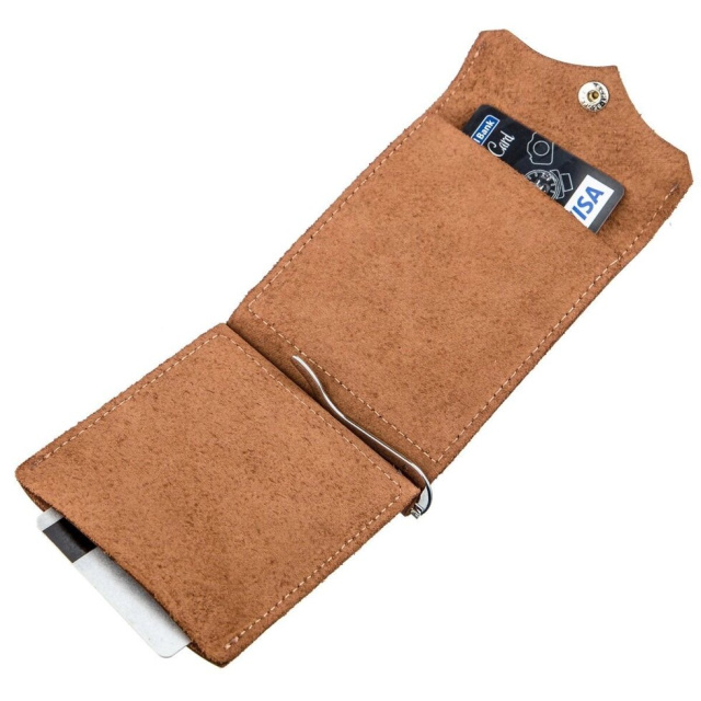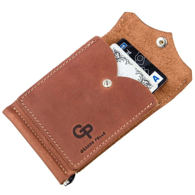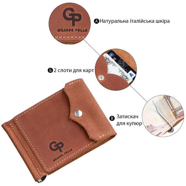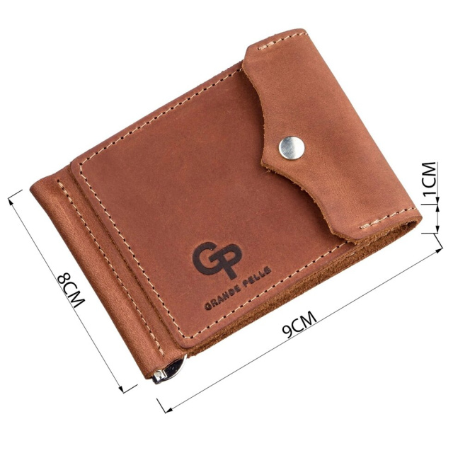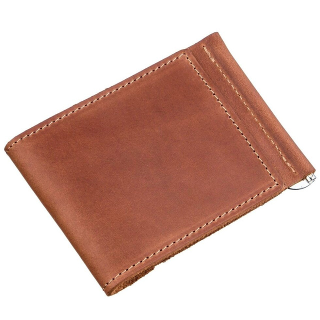 Рудий компактний зажим з італійської натуральної шкіри найвищої якості. На зовнішній стороні аксесуара є тиснення логотипу бренду-виробника. Шкіряні затискачі стануть прекрасним аксесуаром для тих, хто любить мінімалізм і не любить гаманці. З таким виробом ваші купюри будуть в повному порядку. Аксесуар буде корисним подарунком для близької людини.
