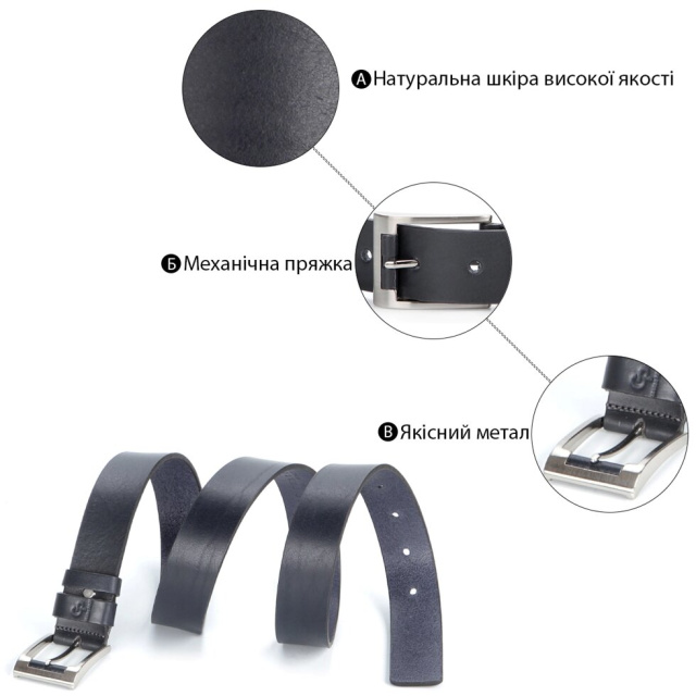 Стильний брючний ремінь - відмінна знахідка для сучасного ділового чоловіка. У цьому аксесуарі поєднуються міцна шкіра хорошої якості, прямокутна пряжка з міцного металу кольору срібла, а також благородний темно-синій відтінок. Цей ремінь можна носити як кожен день, так і вдягати його для більш урочистих випадків, адже він виглядає дійсно гідно і модно.