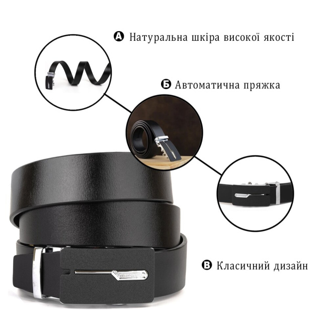 Якісний шкіряний ремінь зі стильним і продуманим до дрібниць дизайном. Виріб має автоматичну пряжку матового чорного кольору і сріблястим силуетом нагадує петельку. Виріб виконаний з якісної шкіри - дуже міцної. Аксесуар упакований в коробку. Автоматична пряжка довго служить і дуже зручна у використанні. Купуючи даний ремінь ви можете бути впевнені, в тому, що це покупка далеко не на один рік. Виріб підійде під будь-яке взуття і одяг і стане прекрасним подарунком для ваших близьких.
