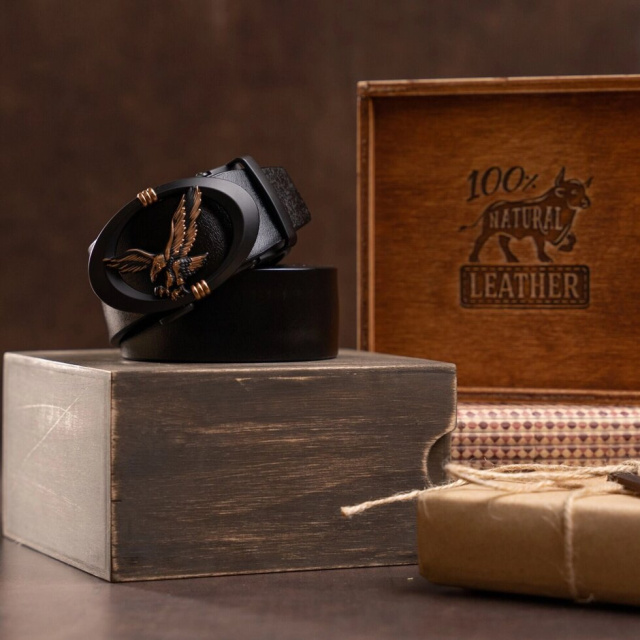 Якісний чоловічий ремінець з натуральної шкіри. Модель з цільного полотна має оригінальний дизайн, продуманий до дрібниць, з урахуванням всіх модних тенденцій. Доповнено ремінь овальною пряжкою чорного кольору з силуетом орла. Пряжка додає ременя оригінальності і не залишить байдужим. Виробництво - фабричний Китай високої якості. Модель підійде як під штани так і під джинси і додасть завершеності вашому образу. Ми впевнені на 100%, що аксесуар прослужить далеко не один рік. Рекомендуємо до покупки даний ремінець.