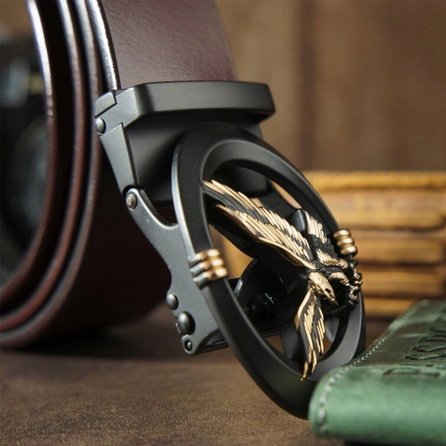 Якісний чоловічий ремінець з натуральної шкіри. Модель з цільного полотна має оригінальний дизайн, продуманий до дрібниць, з урахуванням всіх модних тенденцій. Полотно ременя і пряжка красиво переливаються на сонці, що додає виробу особливого шарму. Доповнено ремінь овальною пряжкою чорного кольору з силуетом орла. Пряжка додає ременю оригінальності і не залишить байдужим. Виробництво - фабричний Китай високої якості. Модель підійде як під штани так і під джинси і додасть завершеності вашому образу. Ми впевнені на 100%, що аксесуар прослужить далеко не один рік. Рекомендуємо до покупки даний ремінець.