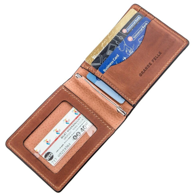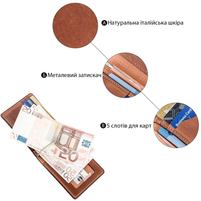 Якісний, компактний, шкіряний затискач з натуральної італійської шкіри. Затискач має фурнітуру сріблястого кольору. На зовнішній і внутрішній стороні аксесуара є тиснення логотипу бренду. По краях модель прошита світлою ниткою. Виріб упакований в повстяний чохол. Аксесуар стане ідеальним рішенням для подарунку близькій людині.