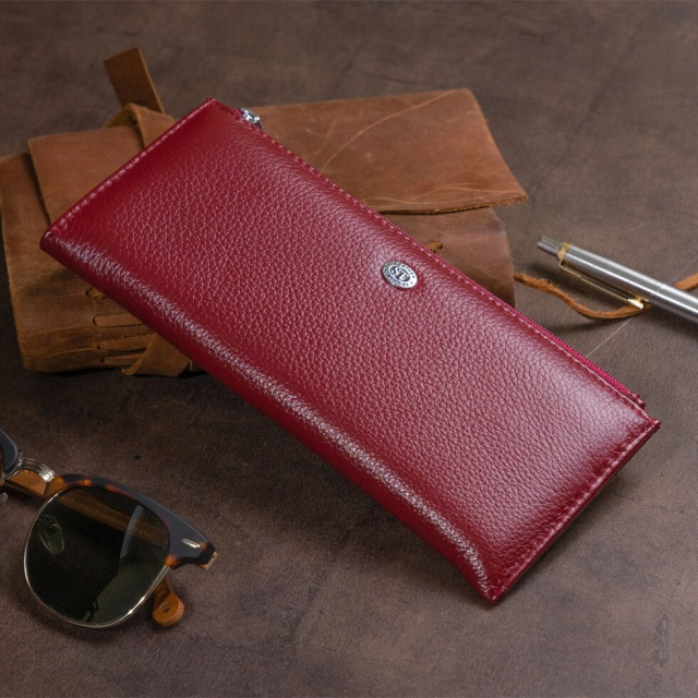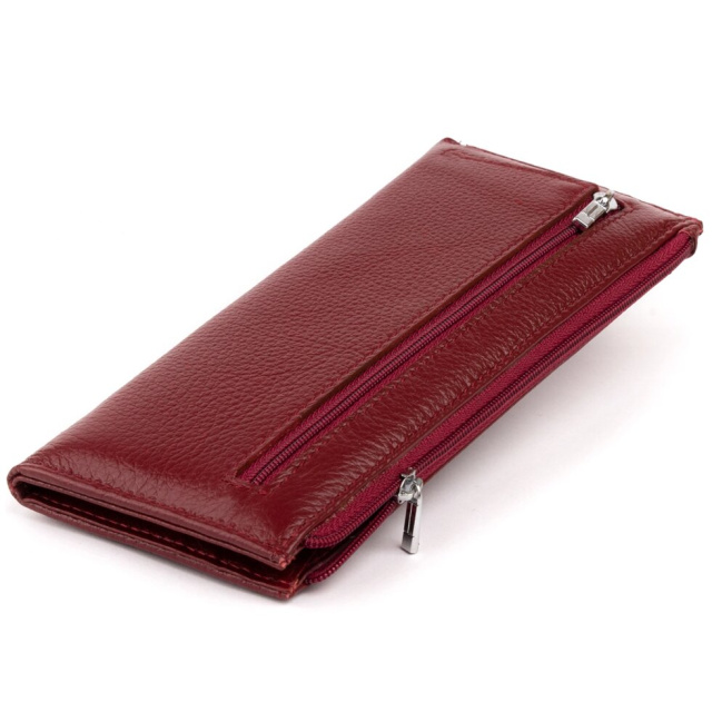 Горизонтальний тонкий гаманець з натуральної шкіри м'якої і еластичної. На лицьовій стороні аксесуара металевий логотип виробника. В виріб поміщаються купюри в розгорнутому вигляді. Закривається аксесуар на блискавку. Зручно лежить в руці і не займає багато місця в сумочці. Виріб благородного бордового кольору. Підійде аксесуар для дівчини будь-якого віку. Гаманець укомплектований в фірмову картонну коробку. Такий аксесуар стане найкращим подарунком для будь-якої дівчини.