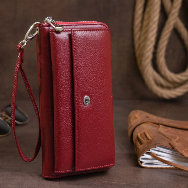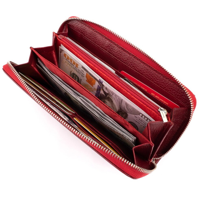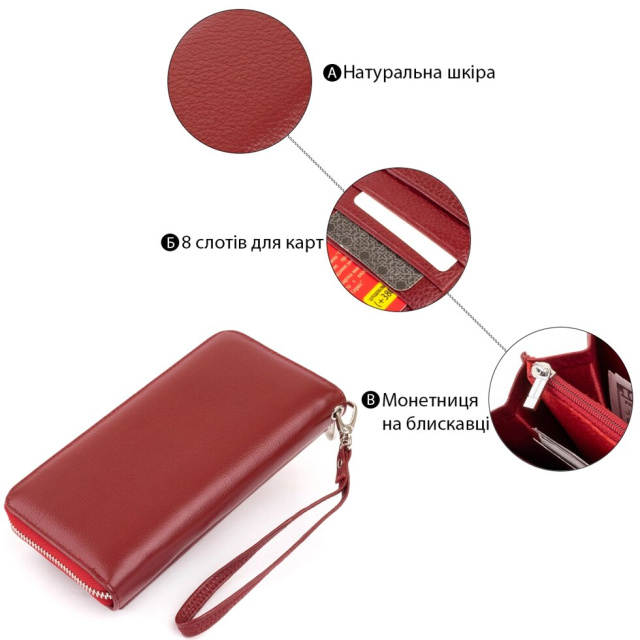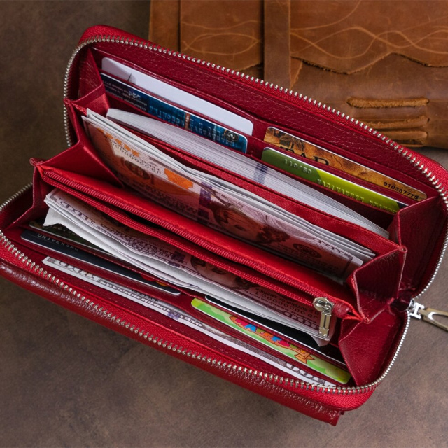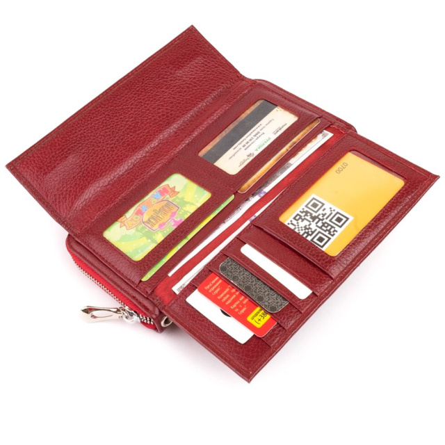 Бордовий шкіряний гаманець для справжніх жінок. Виріб продумано до дрібниць і дуже стильне. Аксесуар ідеально підійде для тих дівчат, що люблять носити багато карток. В такому гаманці ваші купюри будуть в порядку і не помнуться. Має гаманець чотири великих відділення для різних купюр, відділення для особливо цінних речей на блискавці, кишені для карт і візиток, прозорі кишеньки для фото улюблених людей. Товар упакований в фірмову картонну коробку білого кольору.