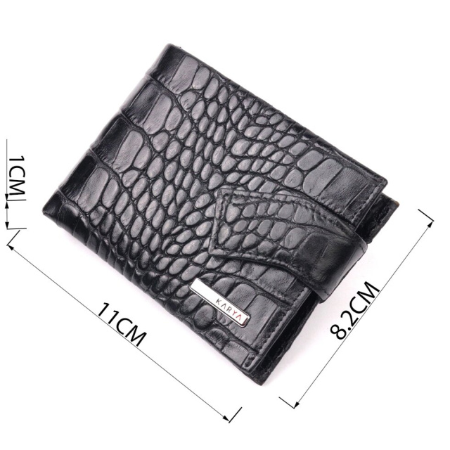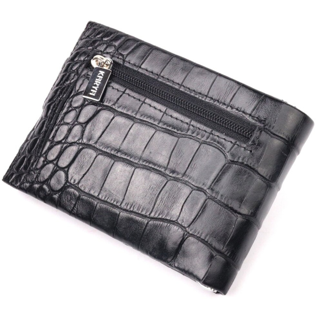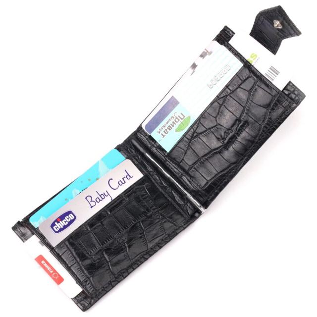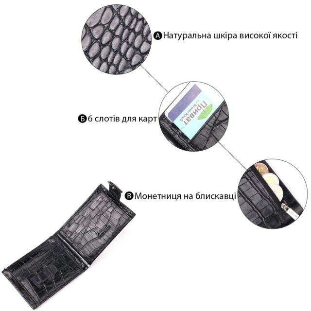 Стильний затискач для купюр виконаний з добротної натуральної шкіри з тисненням під крокодила, чорного кольору. Купюри фіксуються металевим утримувачем. Користь затиску полягає в тому, що він набагато компактніший, ніж гаманець, легко поміщається в руку або кишеню. Крім того, аксесуар надійніше та безпечніше закріплює гроші, тому краще вибрати саме його. Аксесуар упакований у фірмову коробочку. Вироби з натуральної шкіри завжди будуть чудовим подарунком для близької людини.