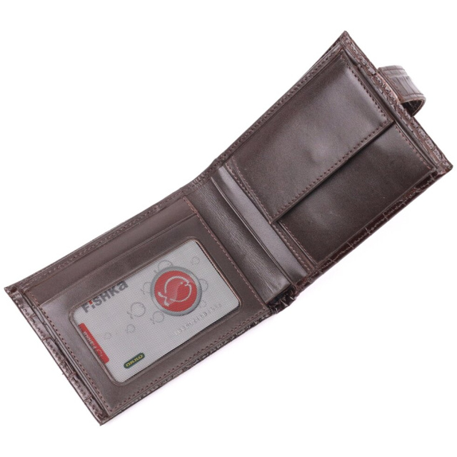 Невеликий чоловічий гаманець із натуральної шкіри з тисненням під рептилію, у коричневому кольорі. Виріб закривається на хлястик із кнопкою . На лицьовій стороні у вигляді декору розташований металевий логотип виробника. Аксесуар упакований у фірмову коробочку. Вироби з натуральної шкіри завжди будуть чудовим подарунком для близької людини.