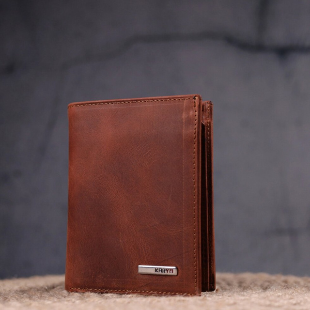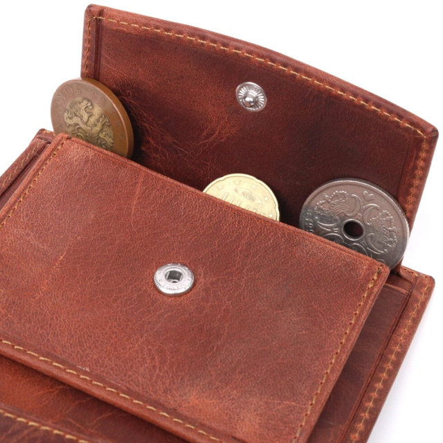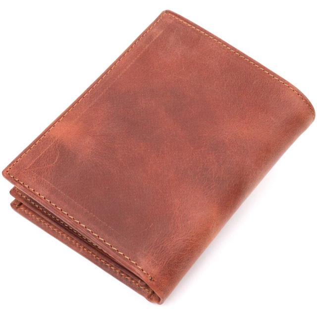 Чоловічий портмоне з натуральної шкіри вінтажної шкіри в сучасному дизайні і незвичайному рудому кольорі. Такий аксесуар оцінять любителі натуральних та якісних речей, виріб виконаний з натуральної шкіри високої якості. Портмоне має містке відділення для купюр, слоти для пластикових карток та монетницю. Цей аксесуар чудово підійде як подарунок і принесе виняткову радість близькій людині.