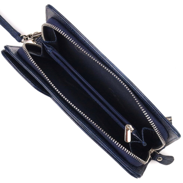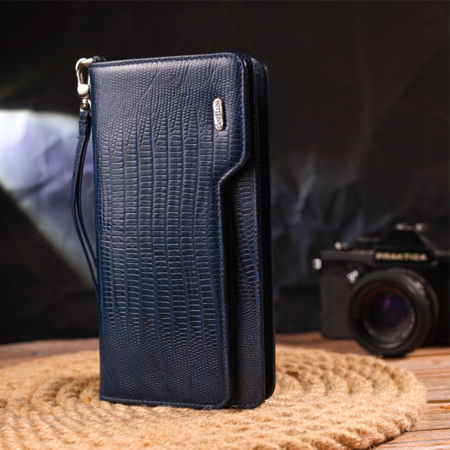 Оригінальний гаманець-клатч, з натуральної фактурної шкіри, з тисненням під рептилію. Аксесуар має одне основне відділення, в яке поміщаються купюри всіх номіналів, дванадцять кишень для карток, одна з яких під сіточкою, блок для карт із зовнішнього боку, дві кишеньки на блискавці, знімний кистьовий ремінь. Закривається аксесуар на блискавку, а блок для карток закривається на кнопки. Колір фурнітури – срібло. Шкіряний гаманець є дивовижним подарунком для рідних та близьких людей.