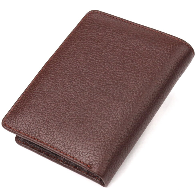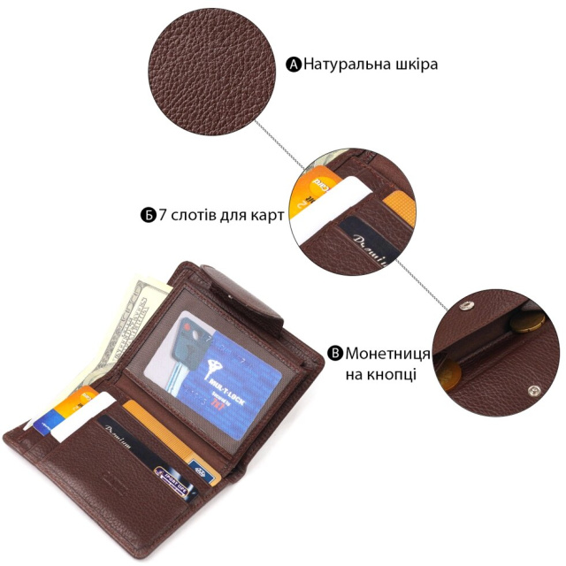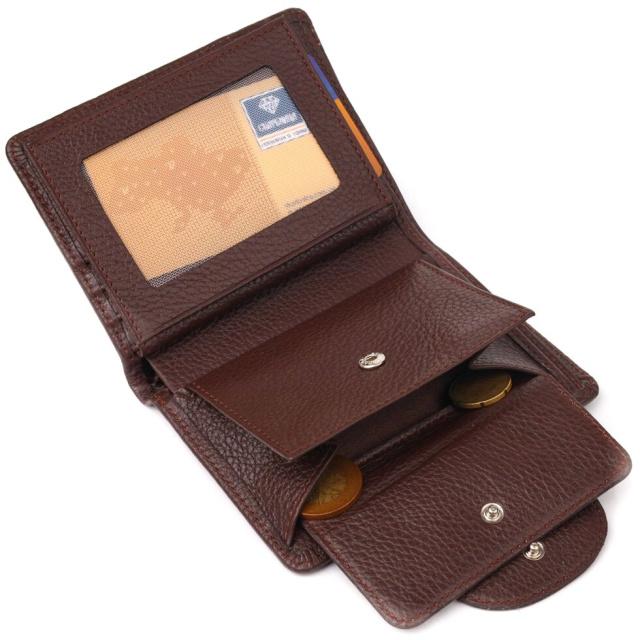 Жіночий гаманець компактного розміру з натуральної шкіри. Аксесуар має відділення для купюр з перегородкою, монетницю, що закривається клапаном на кнопку, приховану кишеню та сім відсіків для карток, два з них під сіточкою. Закривається аксесуар у два складання хлястиком на кнопку. Якісний шкіряний аксесуар завжди вважався показником смаку та достатку, саме такі вироби представлені у нашому магазині, у нас кожен знайде щось для себе.