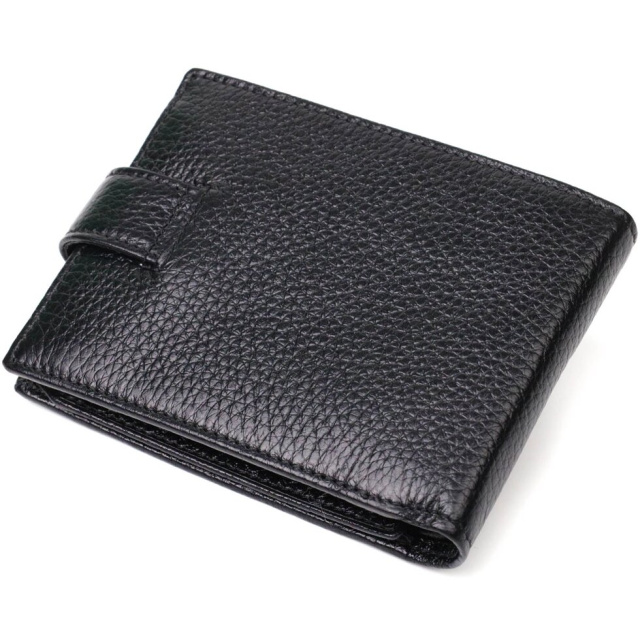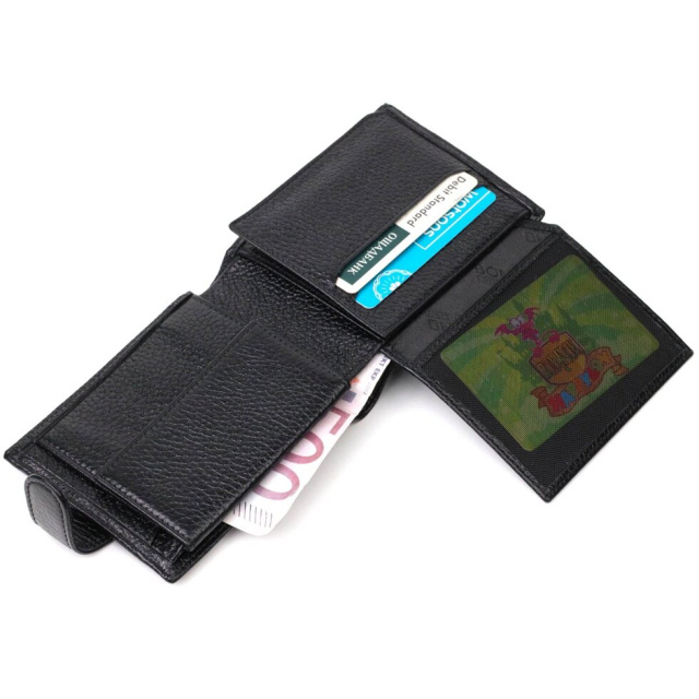 Функціональний гаманець для купюр виконаний із добротної натуральної шкіри чорного кольору. У цей аксесуар чудово поміщаються купюри всіх номіналів. Виріб складається з двох відділень для купюр, дев'яти осередків для кредиток, однієї прихованої кишені, монетниці та двох відділень під сіткою під документи. Закривається гаманець шкіряним хлястиком на кнопку. Вироби з натуральної шкіри завжди будуть чудовим подарунком для близької людини.