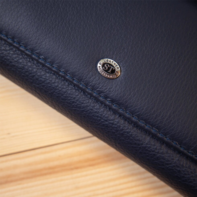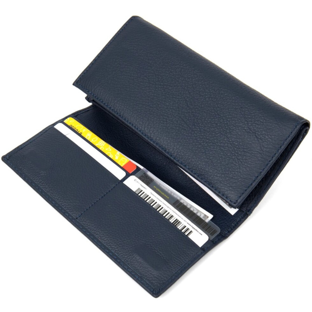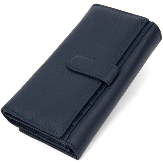 Відмінний жіночий гаманець з натуральної шкіри в спокійному темно-синьому кольорі. Має приємну на дотик фактуру і матове покриття. Має окреме відділення на кнопці спеціально для різних карт, його наповнення можна регулювати. Дана модель обов'язково припаде до смаку навіть найвибагливішим господаркам.
