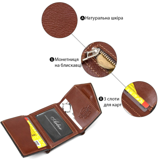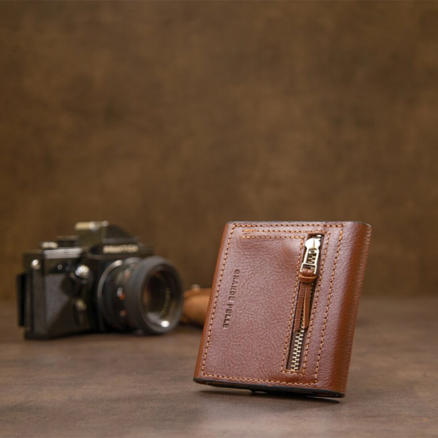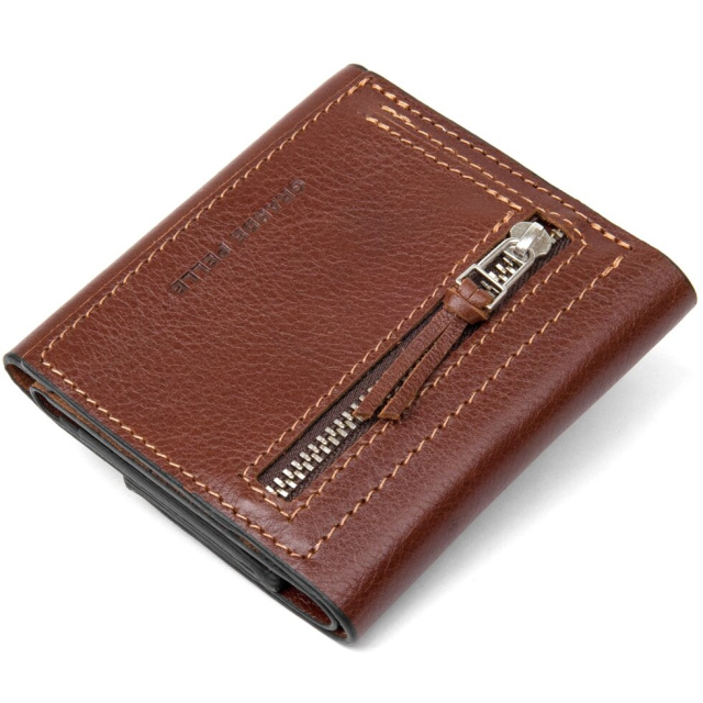 Оригінальне чоловіче портмоне з натуральної шкіри в зернистої фактурі. Колір виробу - коричневий, гаманець має надійні акуратні шви. На зовнішній стороні розмістилася практична невелика монетниця на блискавці, яка дуже зручна у використанні. Упакований аксесуар в фірмовий представницький чохол.