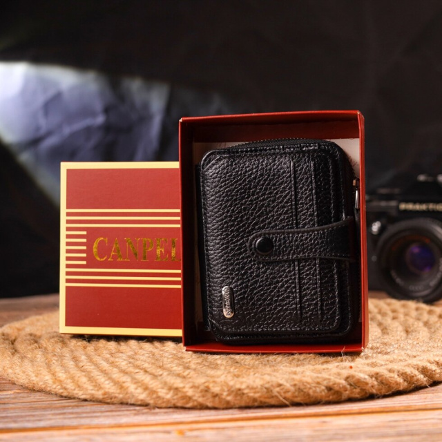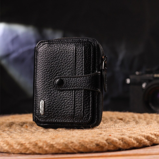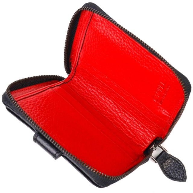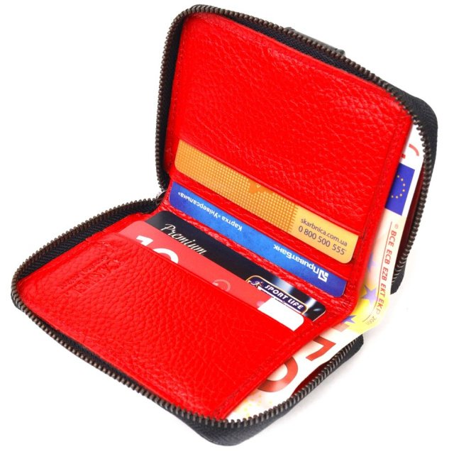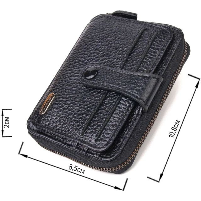 Стильний гаманець для жінок з натуральної зернистої шкіри. Аксесуар має одне основне відділення, в яке поміщаються купюри всіх номіналів, одинадцять кишень для карток, одна з яких під сіточкою, блок для карт із зовнішнього боку, а також кишеня для пропуску під сіточкою з лицьового боку. Закривається аксесуар на блискавку, а блок для карток хлястиком на кнопку. Колір фурнітури – темне срібло. Шкіряний гаманець є дивовижним подарунком для дружини, дівчини, подруги.