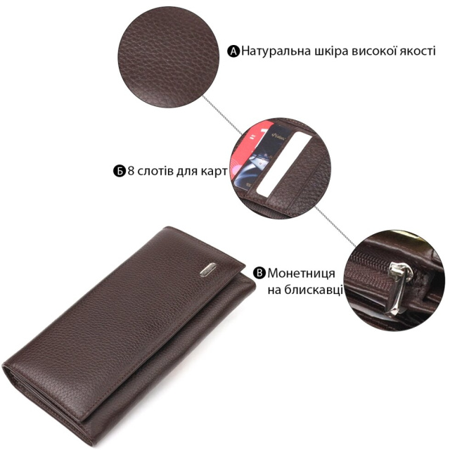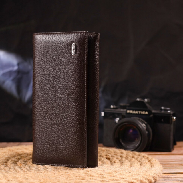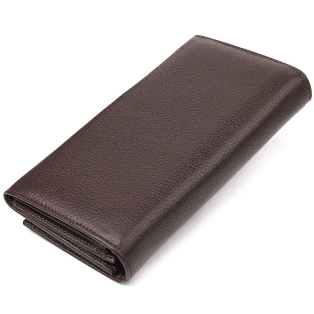 Цікавий горизонтальний жіночий гаманець з натуральної зернистої шкіри в модному коричневому кольорі. Аксесуар має три великі кишені для купюр, три прилеглі кишені, вісім осередків для карток, три з них під сіточкою, монетницю на блискавці. Виріб закривається клапаном на кнопку. Відмінна ідея для подарунка, яка не залишить байдужою жодну жінку.