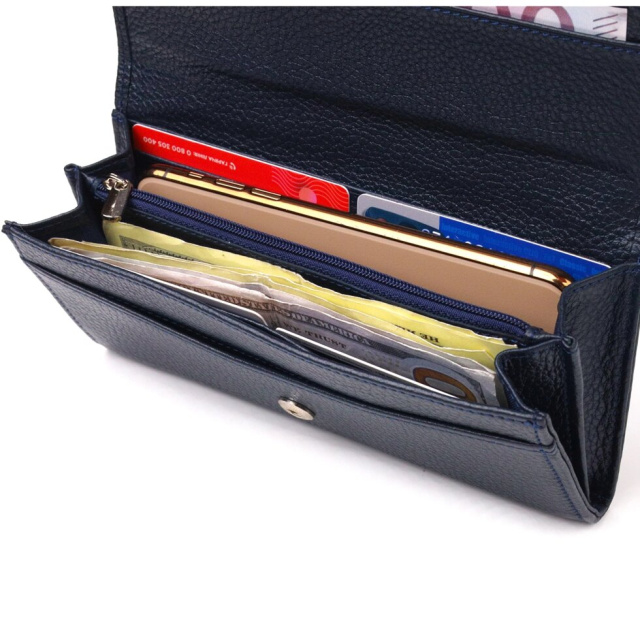 Практичний жіночий гаманець з натуральної зернистої шкіри під назвою флотар. Аксесуар має два широкі основні відділення, в які поміщаються купюри всіх номіналів, кишеня перегородка на блискавці, монетниця, десять кишень для карток, дві прилеглі кишені та одна прихована кишеня. Закривається аксесуар клапаном на кнопку. Якщо Ви хочете порадувати себе та здивувати близьких, то неодмінно купуйте шкіряні аксесуари в нашому магазині, якість і ціна Вас однозначно порадує.