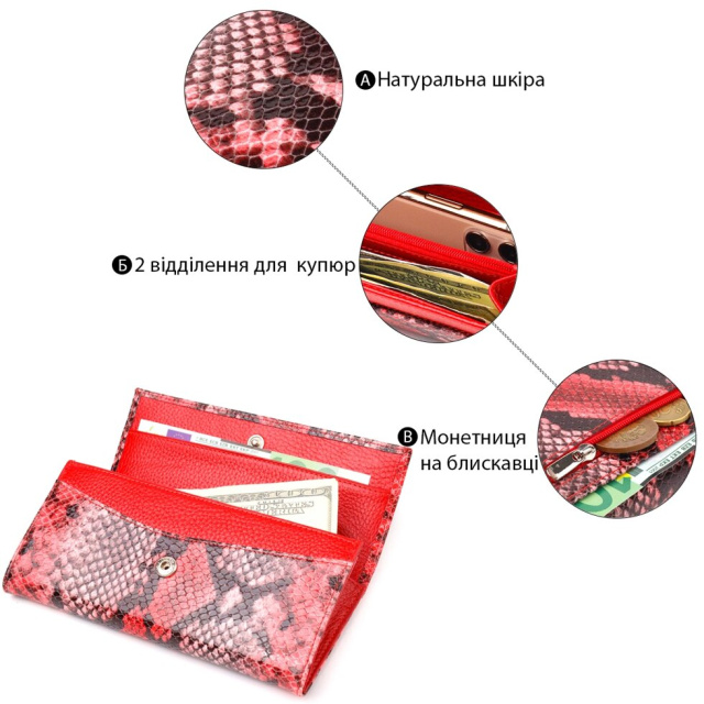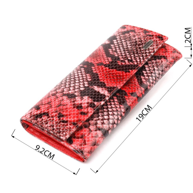 Стильний жіночий гаманець із натуральної фактурної шкіри з тисненням під змію. Аксесуар має два широкі основні відділення, в які поміщаються купюри всіх номіналів, кишеня перегородка на блискавці, монетниця, десять кишень для карток, дві прилеглі кишені та одна прихована кишеня. Закривається аксесуар клапаном на кнопку. Якщо Ви хочете порадувати себе та здивувати близьких, то неодмінно купуйте шкіряні аксесуари в нашому магазині, якість і ціна Вас однозначно порадує.