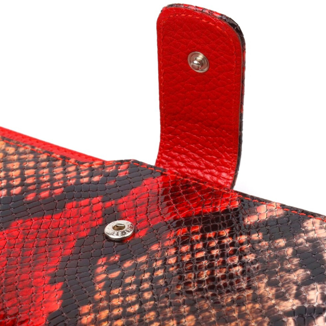 Цікавий жіночий гаманець з натуральної фактурної шкіри з тисненням під змію. Аксесуар має шість прилеглих кишень, у які помістяться купюри всіх номіналів, містку монетницю та двадцять кишень для карток. Закривається аксесуар хлястиком на кнопку. Якщо Ви хочете порадувати себе та здивувати близьких, то неодмінно купуйте шкіряні аксесуари в нашому магазині, якість і ціна Вас однозначно порадує.
