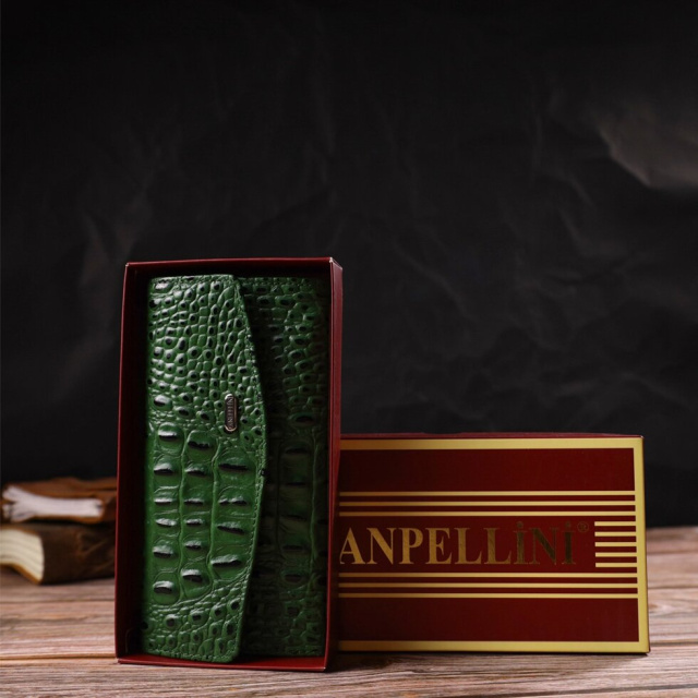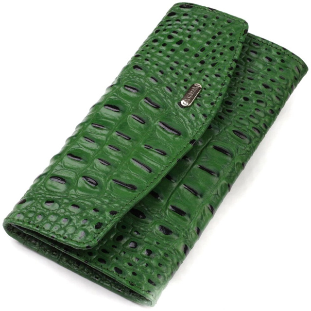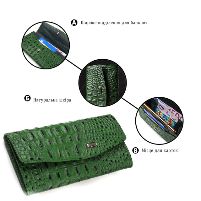 Оригинальний гаманець горизонтального типу із якісної натуральної шкіри з тисненням під крокодила. Аксесуар має одне основне відділення, шість кишень для карток, чотири прилеглі кишені та монетницю. Закривається аксесуар навпіл клапаном на кнопку. Купуючи шкіряний аксесуар цієї фірми, собі або на подарунок, будьте певні, що він прослужить Вам не один рік.