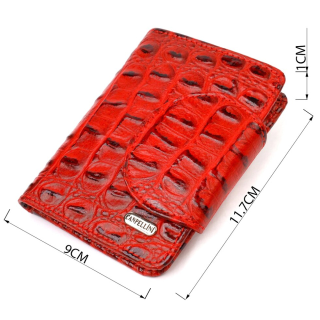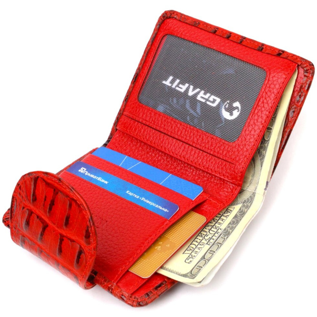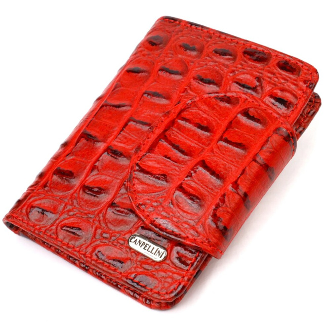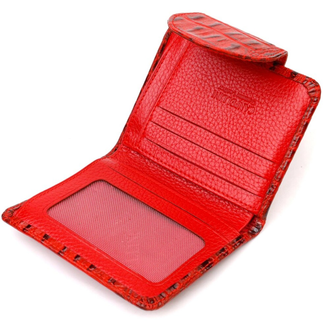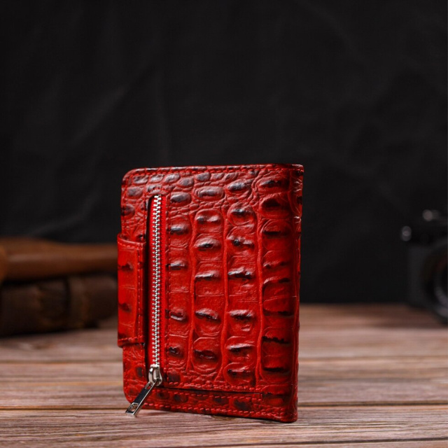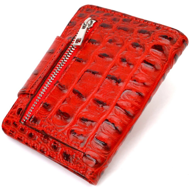 Яскравий жіночий гаманець із натуральної шкіри, з тисненням під крокодила. Аксесуар складається з одного основного відділення з тканинною перегородкою, в яке поміщаються купюри всіх номіналів, чотирьох кишень для карток (одна під сіточкою), трьох прихованих кишень та монетниці. Закривається аксесуар навпіл хлястиком на кнопку. Купуючи шкіряний аксесуар цієї фірми, собі чи на подарунок, будьте певні, що він прослужить Вам не один рік.