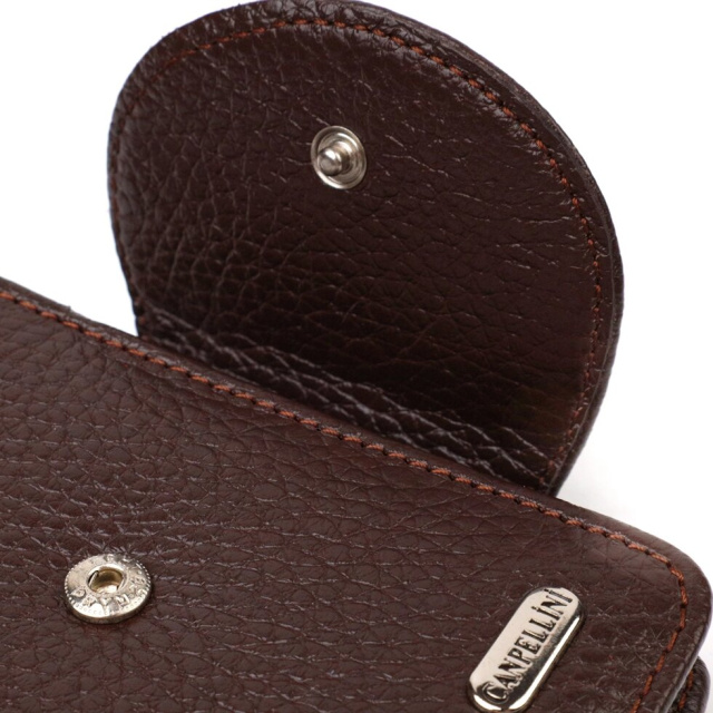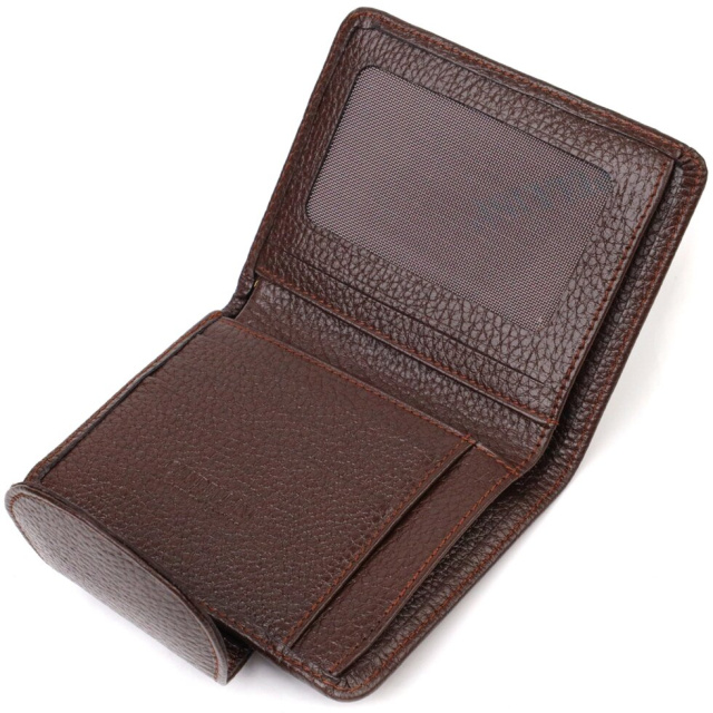 Відмінний жіночий гаманець з натуральної шкіри флотар, яка характеризується своєю міцністю та зносостійкістю. Аксесуар складається з одного основного відділення з тканинною перегородкою, в яке поміщаються купюри всіх номіналів, чотирьох кишень для карток (одна під сіточкою), трьох прихованих кишень та монетниці. Закривається аксесуар навпіл хлястиком на кнопку. Купуючи шкіряний аксесуар цієї фірми, собі чи на подарунок, будьте певні, що він прослужить Вам не один рік.