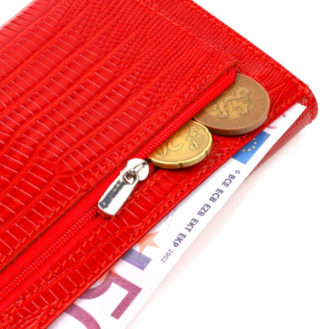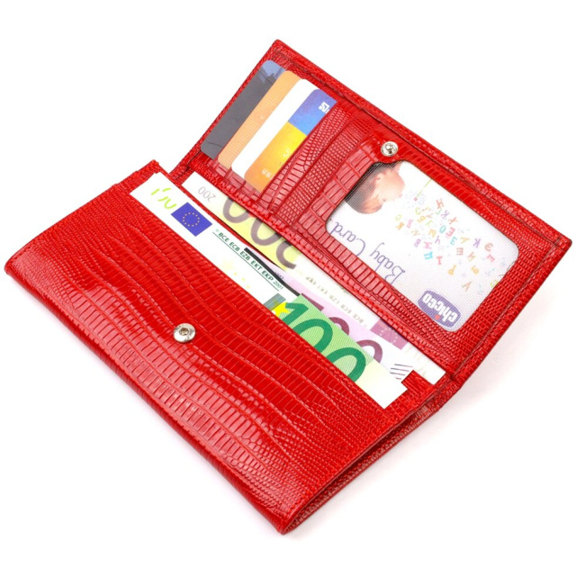 Яскравий фактурний жіночий гаманець горизонтального типу із натуральної шкіри. Аксесуар має одне основне відділення, шість кишень для карток (одна під сіточкою), одна прихована кишеня, три прилеглі кишені та монетниця. Закривається аксесуар клапаном на кнопку. Купуючи шкіряний аксесуар цієї фірми, собі чи на подарунок, будьте певні, що він прослужить Вам не один рік.