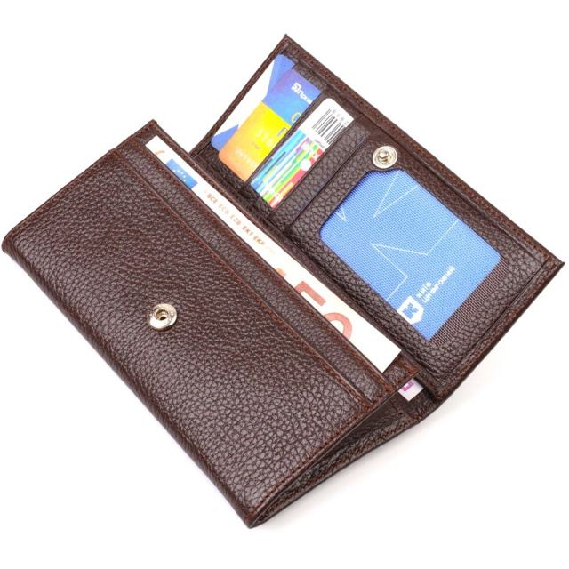 Функціональний жіночий гаманець горизонтального типу із натуральної зернистої шкіри. Аксесуар має одне основне відділення, шість кишень для карток (одна під сіточкою), одна прихована кишеня, три прилеглі кишені та монетницю. Закривається аксесуар клапаном на кнопку. Купуючи шкіряний аксесуар цієї фірми, собі чи на подарунок, будьте певні, що він прослужить Вам не один рік.