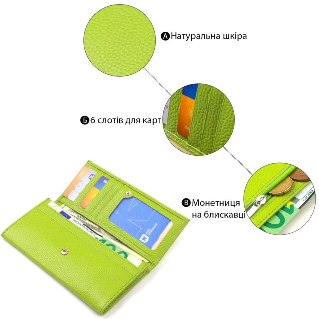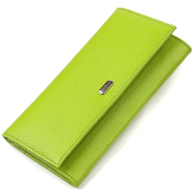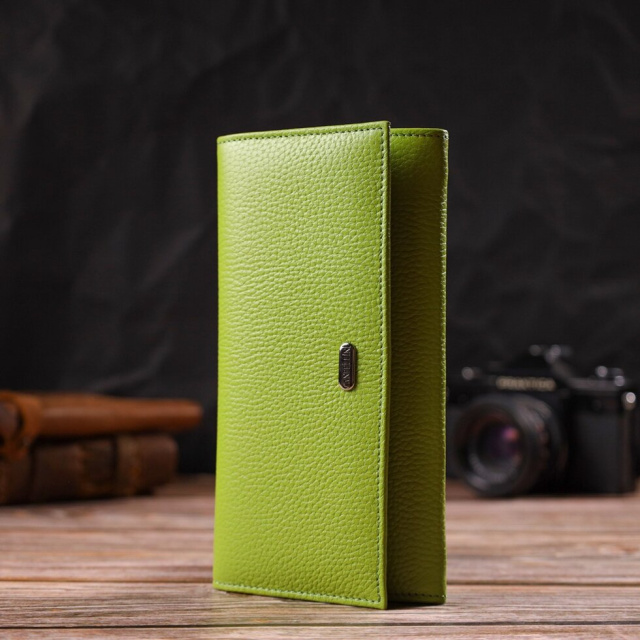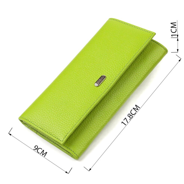 Виразний жіночий гаманець горизонтального типу із натуральної зернистої шкіри. Аксесуар має одне основне відділення, шість кишень для карток (одна під сіточкою), одна прихована кишеня, три прилеглі кишені та монетниця. Закривається аксесуар клапаном на кнопку. Купуючи шкіряний аксесуар цієї фірми, собі чи на подарунок, будьте певні, що він прослужить Вам не один рік.