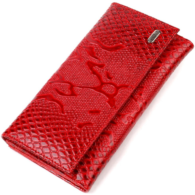Яскравий гаманець для жінок із натуральної шкіри, з тисненням під рептилію. Аксесуар має одне основне відділення, сімнадцять кишень для карток, чотири прилеглі кишені та монетницю. Особливістю даної моделі є наявність блоку для кредитних карток, який закривається хлястиком на кнопку. На лицьовій стороні, у правому нижньому куті металевий логотип компанії виробника. Якщо ви вибрали товар цієї фірми, можете не сумніватися, що виріб прослужить дуже довго і не втратить свого первісного вигляду.