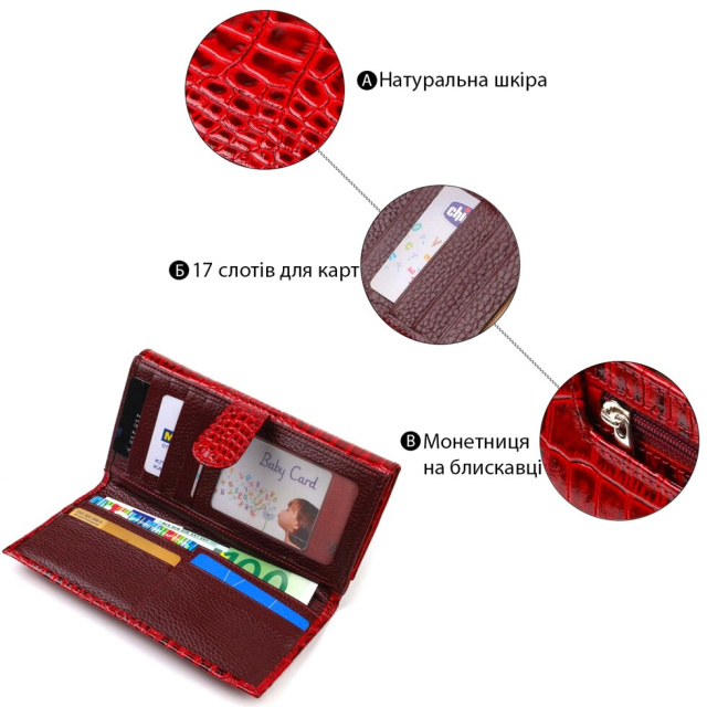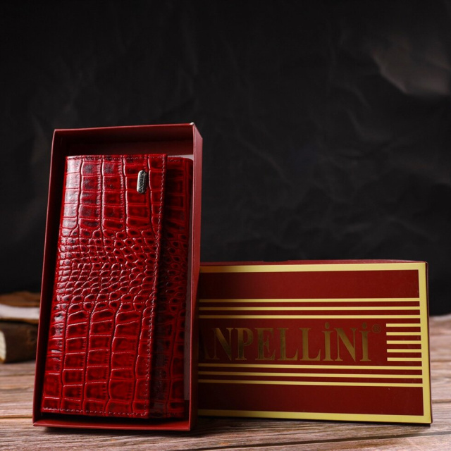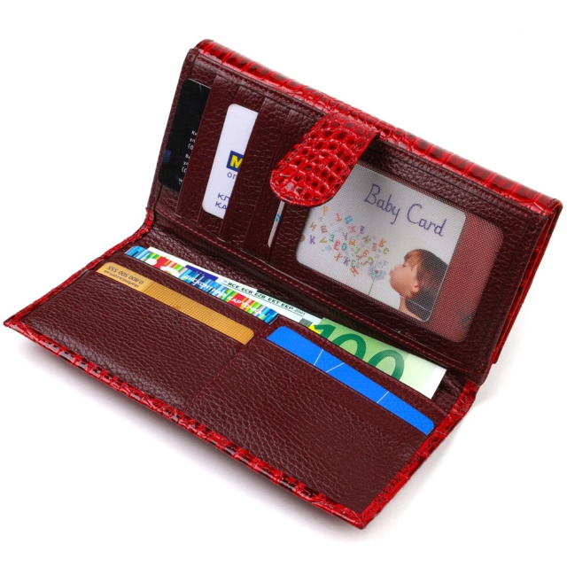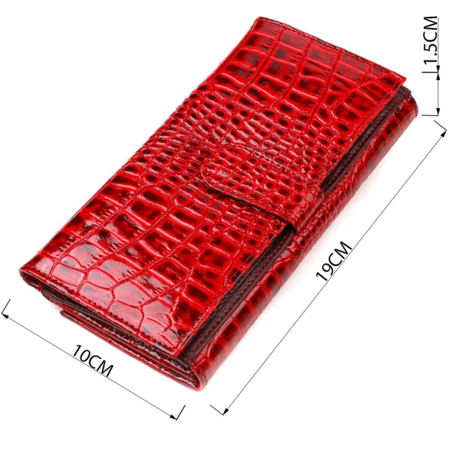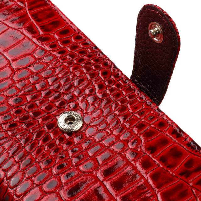 Лакований гаманець для жінок, які люблять зручність і простоту з натуральної шкіри з тисненням під крокодила. Аксесуар має одне основне відділення, сімнадцять кишень для карток, чотири прилеглі кишені та монетницю. Особливістю даної моделі є наявність блоку для кредитних карток, який закривається хлястиком на кнопку. На лицьовій стороні, у правому нижньому куті металевий логотип компанії виробника. Якщо ви вибрали товар цієї фірми, можете не сумніватися, що виріб прослужить дуже довго і не втратить свого первісного вигляду.