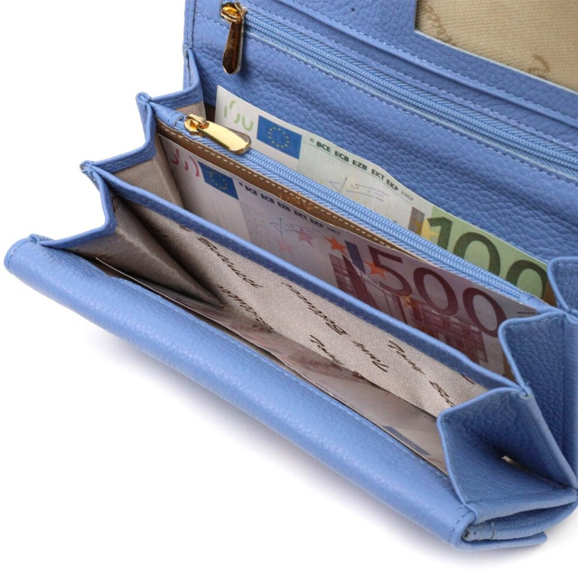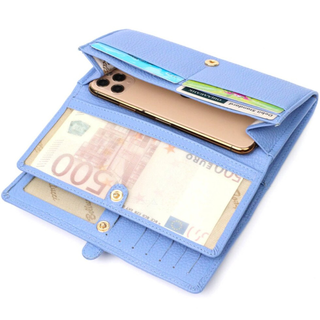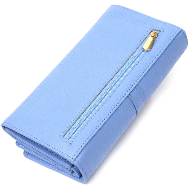 Модний жіночий гаманець із натуральної шкіри флотар, для якої характерна міцність, зносостійкість та зерниста фактура. Аксесуар складається з чотирьох широких відділень для купюр, одинадцяти осередків для пластикових карток, двох прилеглих кишень та трьох кишень на блискавках, які можна використовувати як монетниці. У виробі використано якісну фурнітуру золотистого кольору. Закривається гаманець клапаном на кнопку. Купуючи шкіряний гаманець собі або на подарунок усі хочуть отримати якісну та стильну річ, саме такі вироби представлені у нашому магазині, а наші досвідчені менеджери допоможуть визначитися з вибором.