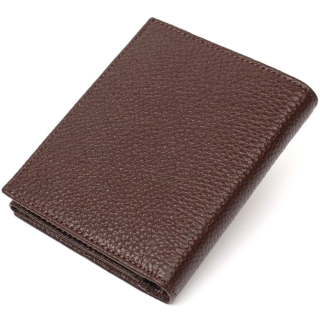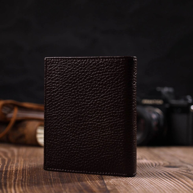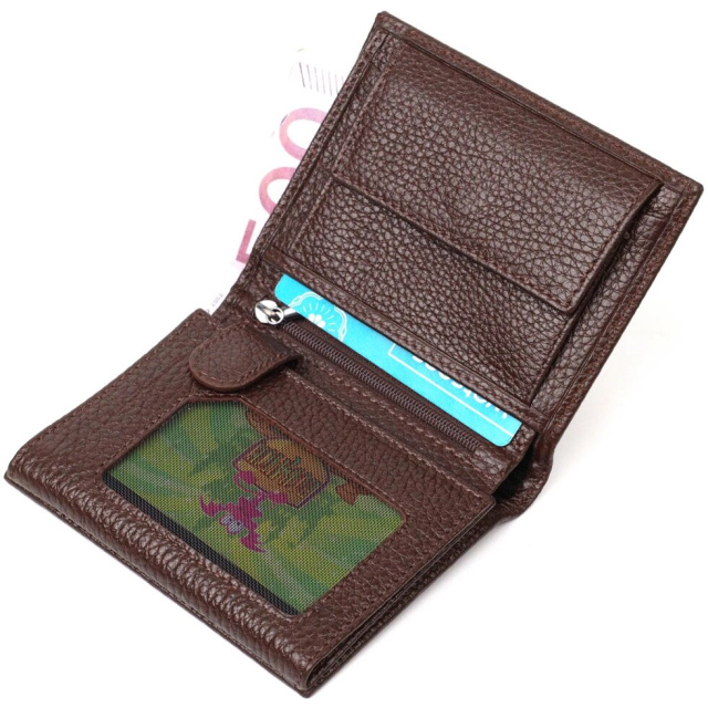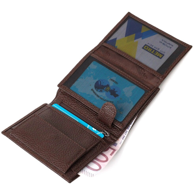 Невеликий гаманець для купюр, вертикального типу, виготовлений з добротної натуральної шкіри. У цей аксесуар чудово поміщаються купюри всіх номіналів. Виріб складається з двох відділень для купюр, шести осередків для кредиток, трьох прихованих кишень (одна з них на блискавці), монетниці та трьох відділень під сіткою під документи. Закривається гаманець навпіл, без застібки. Вироби з натуральної шкіри завжди будуть чудовим подарунком для близької людини.