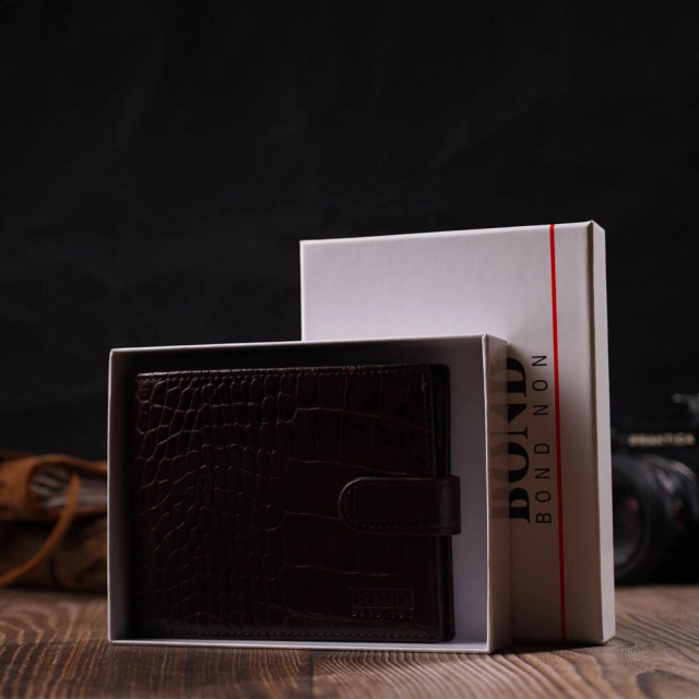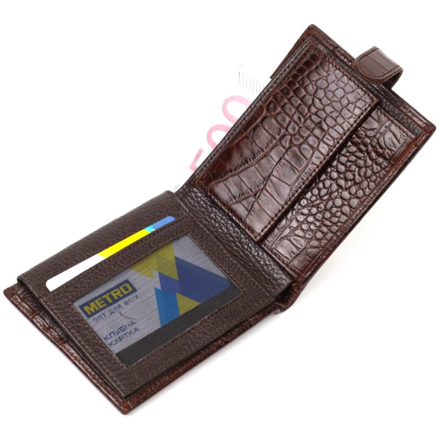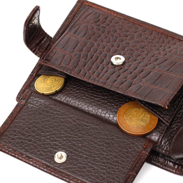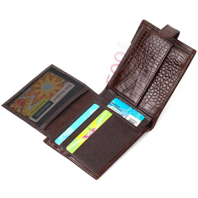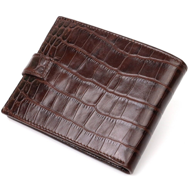 Стильне чоловіче портмоне з натуральної шкіри горизонтального типу з тисненням під крокодила. У цей аксесуар чудово поміщаються купюри всіх номіналів. Виріб складається з трьох відділень для купюр, трьох осередків для кредиток, трьох прихованих кишень, двох відділень під сіткою та монетниці. Закривається гаманець навпіл шкіряним хлястиком на кнопку. Вироби з натуральної шкіри завжди будуть чудовим подарунком для близької людини.
