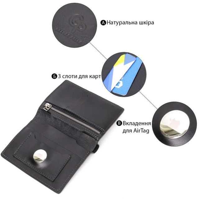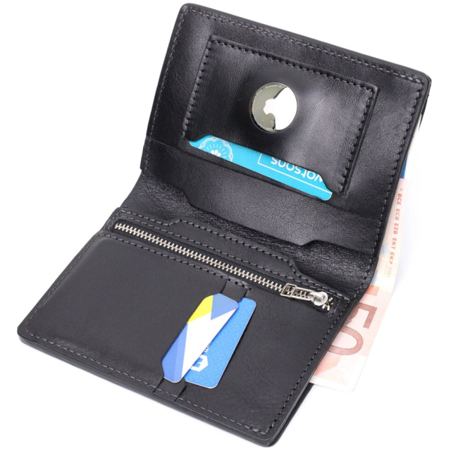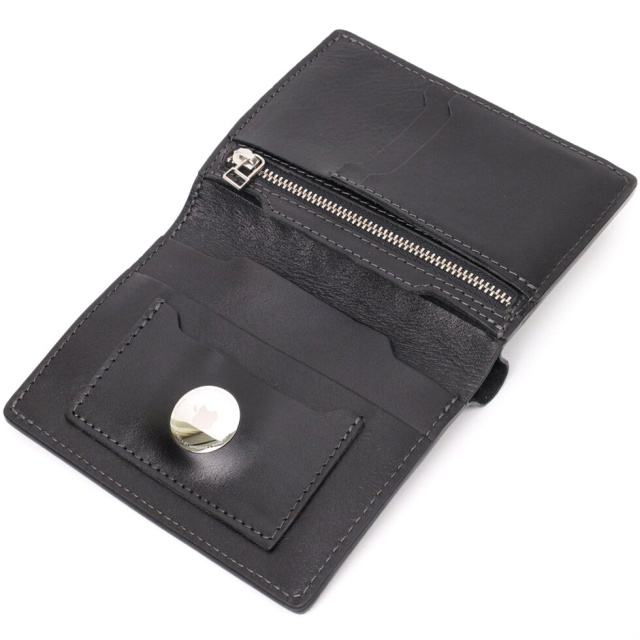 Ультрамодне портмоне виконане виключно з натуральної італійської шкіри найвищої якості. По краях аксесуар прошитий рівним рядком в дизайн виробу. Гаманець складається з одного місткого відділення для купюр, трьох слотів під кредитки, монетниці на блискавці, чотирьох прилеглих кишень та тримача для смарт-трекера Apple AirTag. Смарт трекер Apple AirTag, це сучасний пристрій, що визначає місцезнаходження речі до якої він прикріплений. Ми впевнені, що вироби української фірми Grande Pelle, нікого не залишать байдужими, і Ви ще неодноразово повернетесь за цими якісними шкіряними аксесуарами. Увага, смарт трекер Apple AirTag не входить у комплект з аксесуаром!