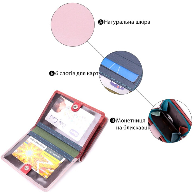 Відмінне портмоне в два складання компактного розміру з натуральної шкіри найвищої якості. Гаманець бежево-рожевого кольору зовні та різнобарвний усередині, що дуже стильно та сучасно. Шкіряне портмоне дуже практичне і служить досить довго. Аксесуар складається з двох містких кишень для купюр, кишені на блискавці для монет, шести осередків для карт, двох прозорих віконець для перепусток або фотографій та двох прихованих кишень. Портмоне доповнено надійною фурнітурою і прошито по краю рівним рядком бірюзового кольору. Укомплектований гаманець у фірмову картонну коробку білого кольору. Виріб стане ідеальним подарунком для дівчини будь-якого віку.