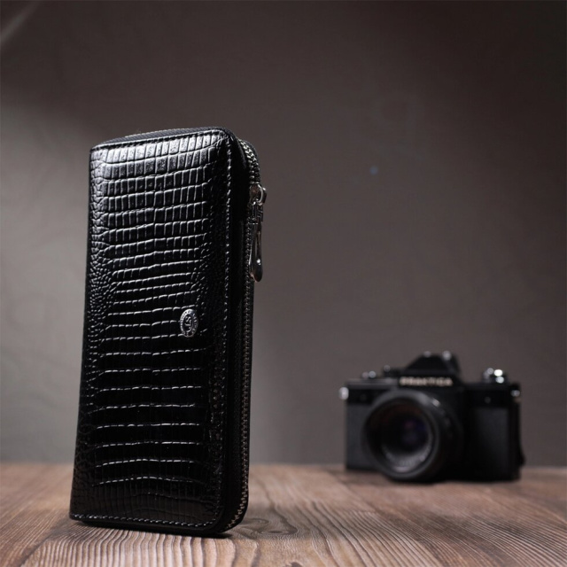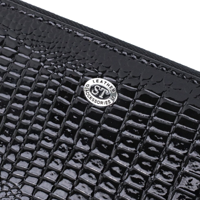 Відмінний гаманець-клатч для ділових та заповзятливих людей. Виконаний з м'якої першокласної лакованої шкіри високої якості з тисненням під рептилію. Колір виробу – чорний. Має одне основне відділення, яке закривається на блискавку. Усередині є багато відділень для купюр, осередків для карт та монетниця. Для зручності використання також передбачений знімний кистьовий ремінь. Запакований аксесуар у білу щільну картонну коробку з фірмовим логотипом.
