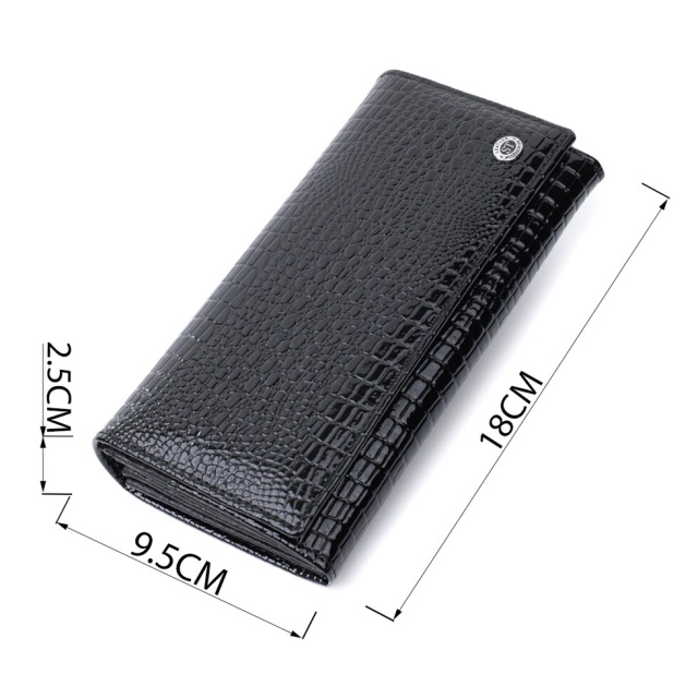 Зручний жіночий гаманець із лакованої натуральної шкіри, з тисненням під рептилію. Така шкіра має чудові експлуатаційні характеристики. Зовні виріб прикрашений металевим логотипом компанії-виробника, що є гарантією якості. Портмоне доповнено надійною фурнітурою та міцною підкладкою. Укомплектований гаманець у фірмову картонну коробку білого кольору. Такий гаманець стане бажаним подарунком для жінок будь-якого віку та соціального статусу.