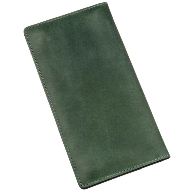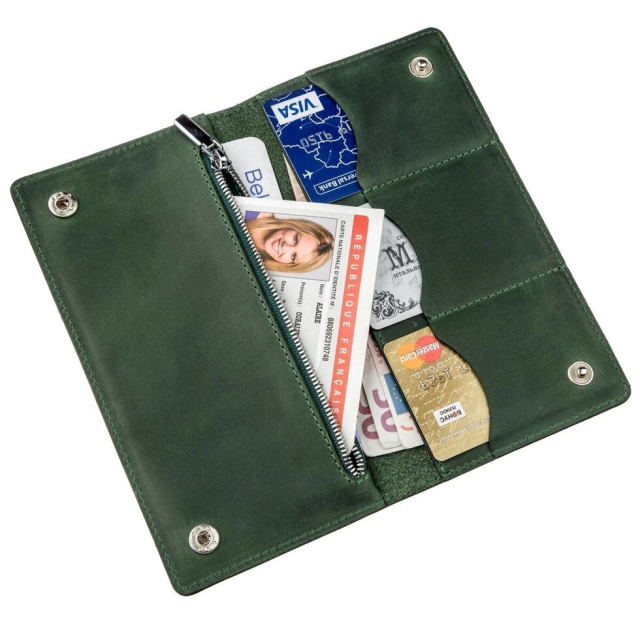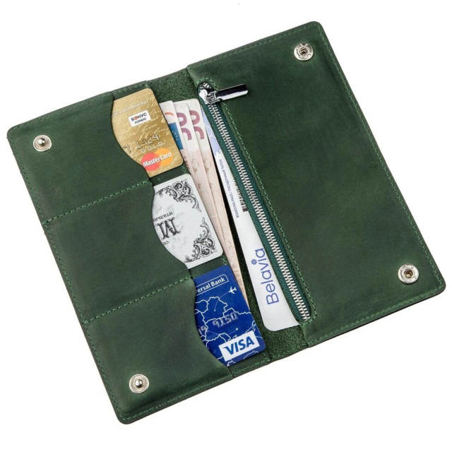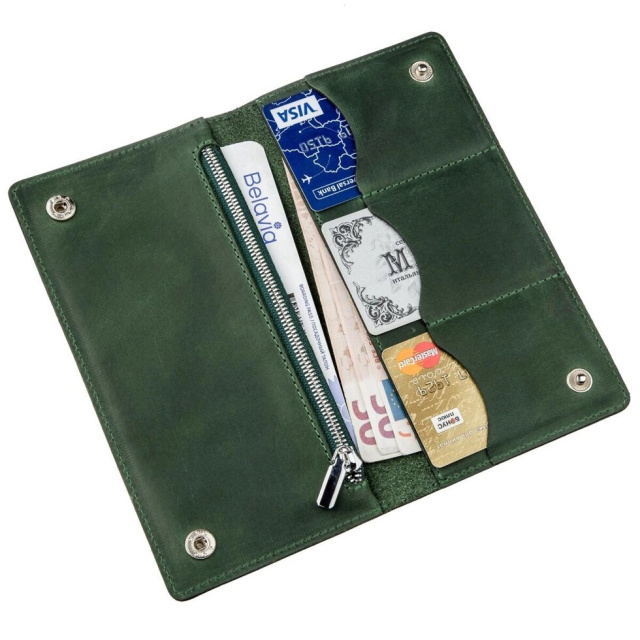 Стильний гаманець унісекс зеленого кольору. Аксесуар підійде як для чоловіка, так і жінки. Вироблено в Україні. Ви можете не сумніватися в найвищій якості виробу. Виробники використовують тільки натуральну шкіру високої якості і якісну фурнітуру. Виріб має відділення для купюр і слоти для карток, а також кишеньку на блискавці, яку при бажанні ви можете використовувати для дрібниць. Рівна зелена стрічка по краях доповнює бездоганний дизайн. Модель стане прекрасним подарунком як для чоловіка, так і жінки.