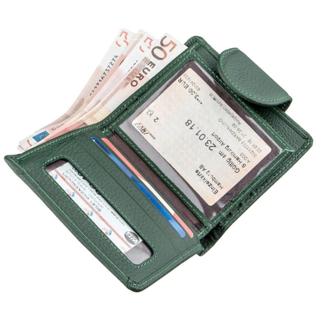 Невеликий жіночий гаманець з натуральної шкіри. При своєму досить компактному розмірі аксесуар досить функціональний. По краях прошитий гаманець рівною зеленою стрічкою. М'яка і якісна шкіра і доступна вартість роблять модель особливо популярною. Аксесуар упакований в картонну фірмову коробку й стане прекрасним подарунком для будь-якої дівчини.