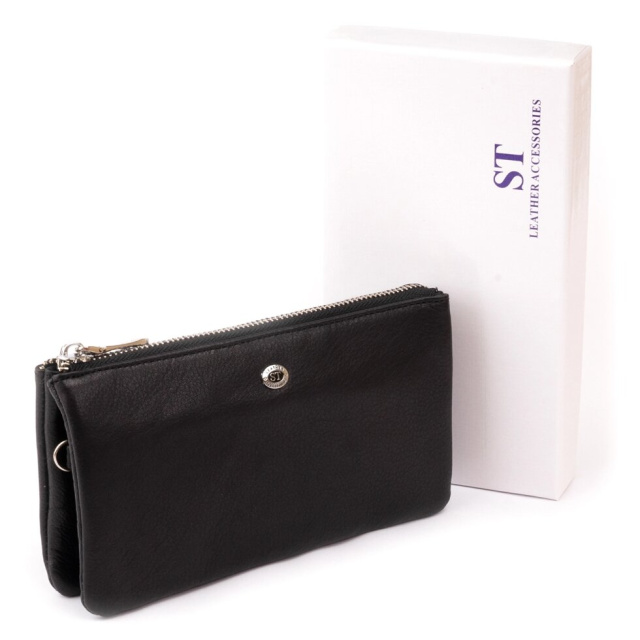 Чорний універсальний клатч відрізняється своєю місткістю. В дану модель легко поміститься ваш смартфон. Таким чином модель здатна замінити вечірню сумочку. Носити ж клатч можна за допомогою шкіряного ремінця на зап'ясті. Дві містких кишені допоможуть зручно розкласти вам гроші, також клатч має досить слотів для кредиток. Перевагою чорного кольору є те, що він не прив'язує вас до певної колірної палітри в гардеробі. Він підходить під все.Сам клатч м'який і приємний на дотик. Усередині клатч зроблений з натуральної шкіри і щільного текстилю. У комплекті йде фірмова коробка з логотипом бренду. Шкіряний клатч стане найкращим подарунком для близької людини.