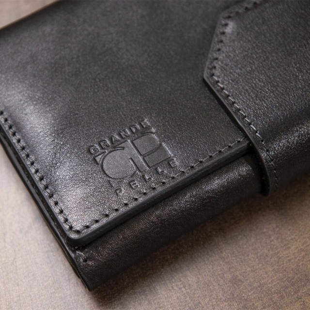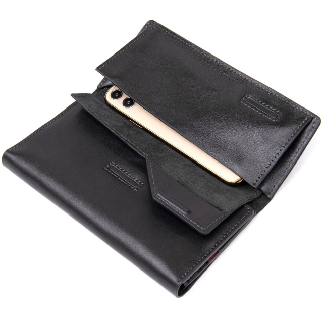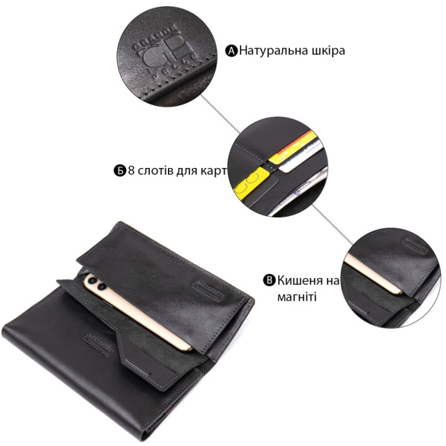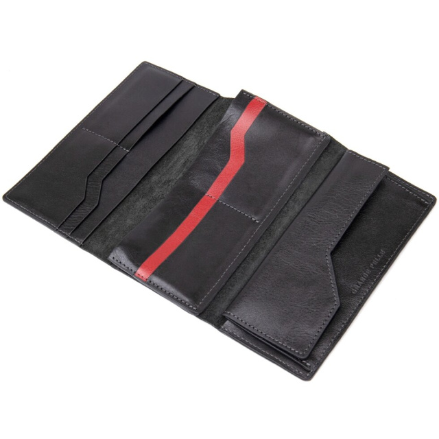 Багатофункціональний портмоне на хлястику з магнітом. Має всередині місткі і практичні відділення для купюр, велику монетницю на магніті і вісім слотів для різних карт і візиток. Матеріал виготовлення - натуральна м'яка на дотик шкіра. Колір виробу чорний, що робить гаманець практично універсальним. Упаковка - фірмова картонна коробка.