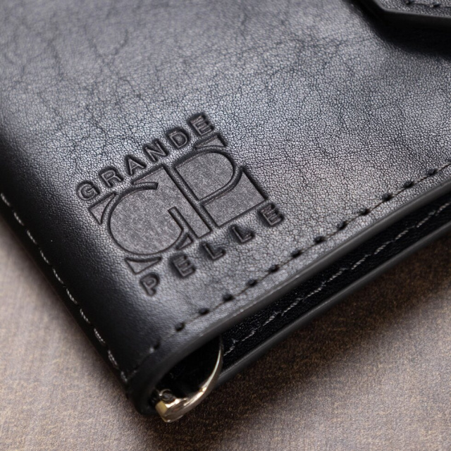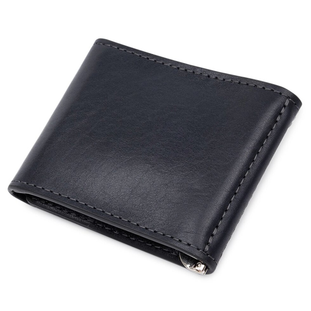 Зручний і практичний компактний затиск для грошей з висококласної шкіри, яка має відмінні експлуатаційні характеристики. Має темно-синій глибокий колір і гладку фактуру. Усередині крім металевого затиску, є ще дві кишеньки для карток. Закривається виріб на невеликій клапан з прихованим магнітом.