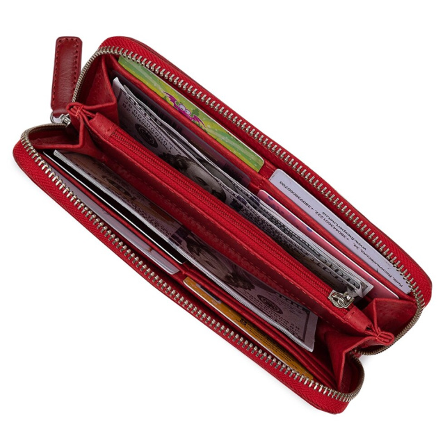 Чудовий гаманець для жінок в соковитому червоному кольорі. Матеріал виготовлення - висококласна натуральна шкіра, яка стійка до зносу. Поверхня гладка без особливого блиску. Всередині є місткі відділення, кишені для візитних і кредитних карт і монетниця на блискавці. Упакований аксесуар в фірмову картонну коробку.