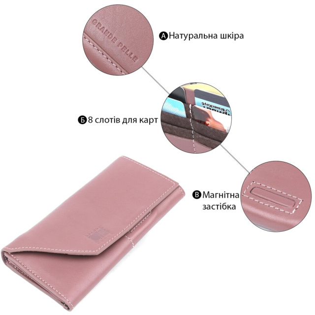 Чудовий жіночий гаманець від відомого виробника у стильному лаконічному дизайні. Виконаний аксесуар з натуральної шкіри високої якості, яка дуже м'яка та приємна на дотик. Колір виробу – рожевий із сірим відтінком, фактура – гладка. Закривається гаманець за допомогою клапана на магніті, на практиці це дуже зручно та практично.