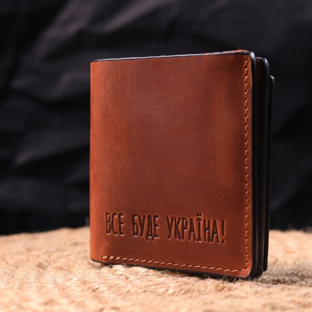 Чудовий шкіряний гаманець у світло-коричневому кольорі з патріотичним написом “Все буде Україна”. Виріб пошитий із якісної гладкої шкіри, з високими показниками зносостійкості. Портмоне має два великих відділення для купюр усіх номіналів, а також достатню кількість відділень для карток та монетницю, застібається виріб на надійний магніт. Шкіряний гаманець стане чудовим подарунком на всі випадки життя.