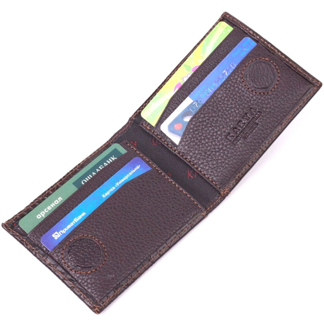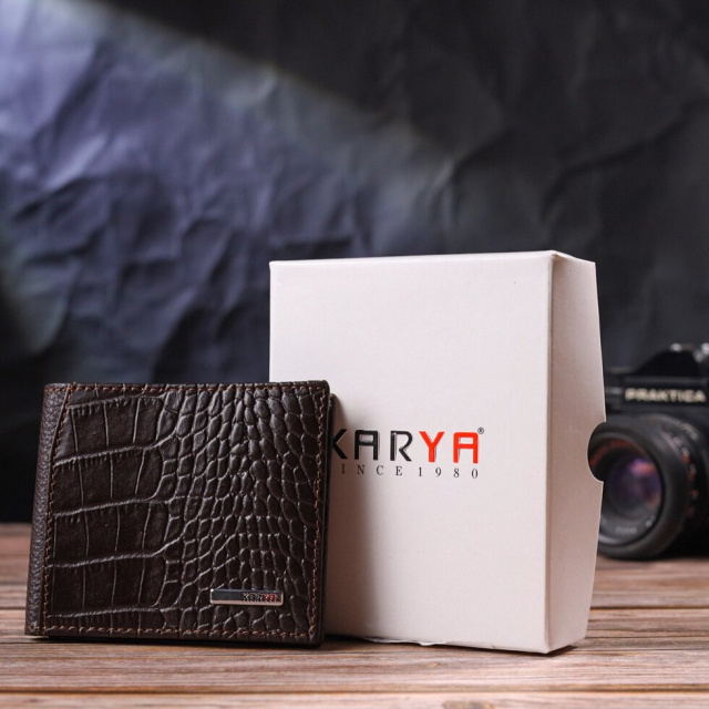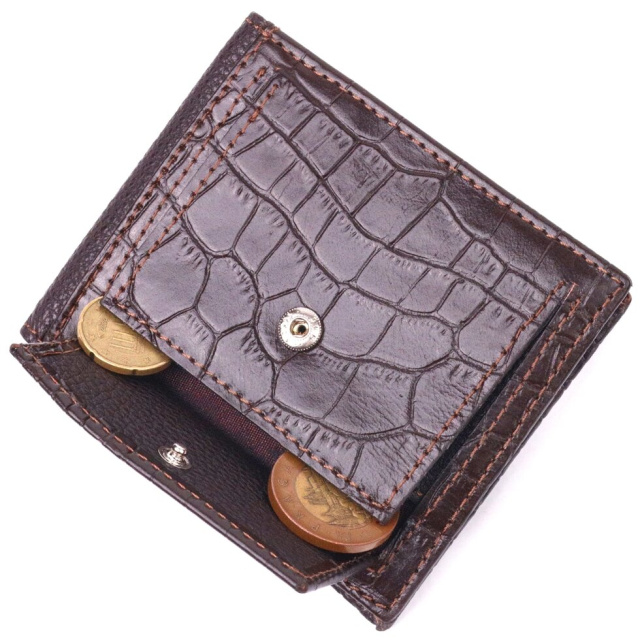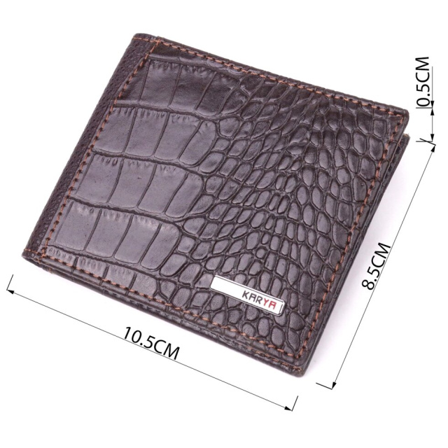 Чудовий чоловічий затиск із натуральної фактурної шкіри, з тисненням під крокодила. Затискач складається з двох куточків тримачів для купюр, шести осередків для кредитних карток, двох прилеглих кишень зовні та монетниці, що закривається клапаном на кнопку. Виріб закривається у два складання на магніт. Аксесуар упакований у фірмову коробочку. Вироби з натуральної шкіри завжди будуть чудовим подарунком для близької людини.