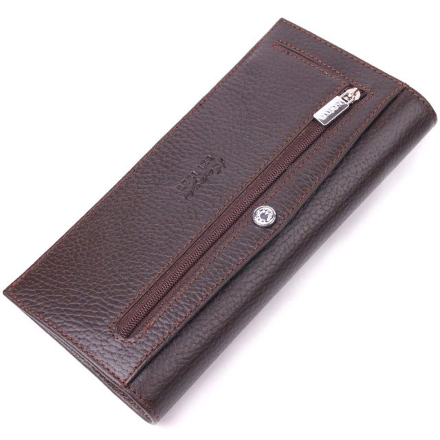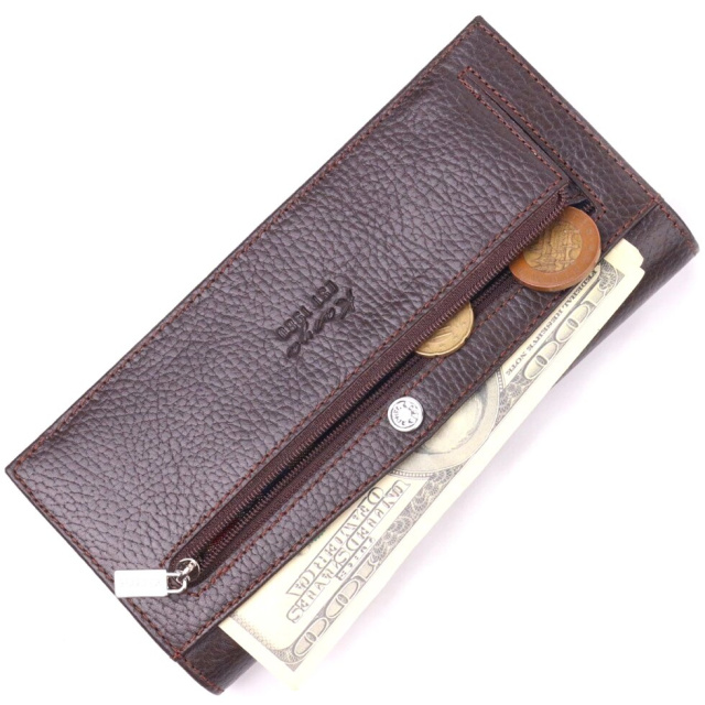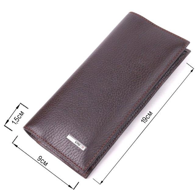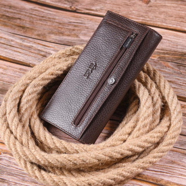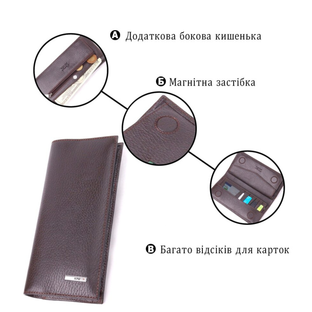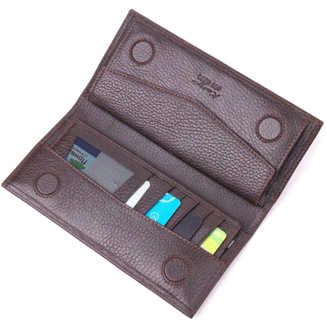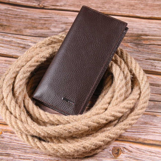 Зручне чоловіче портмоне із натуральної зернистої шкіри в красивому коричневому кольорі. Виріб має продуманий до дрібниць дизайн та якісну фурнітуру, дуже практичний. У портмоне містяться купюри у розгорнутому вигляді. Доповнено аксесуар блоком для кредиток, який витягується, він розташовується всередині гаманця у спеціальній кишеньці. Виріб зручно лежить у руці. Чудовий подарунок для ваших близьких.